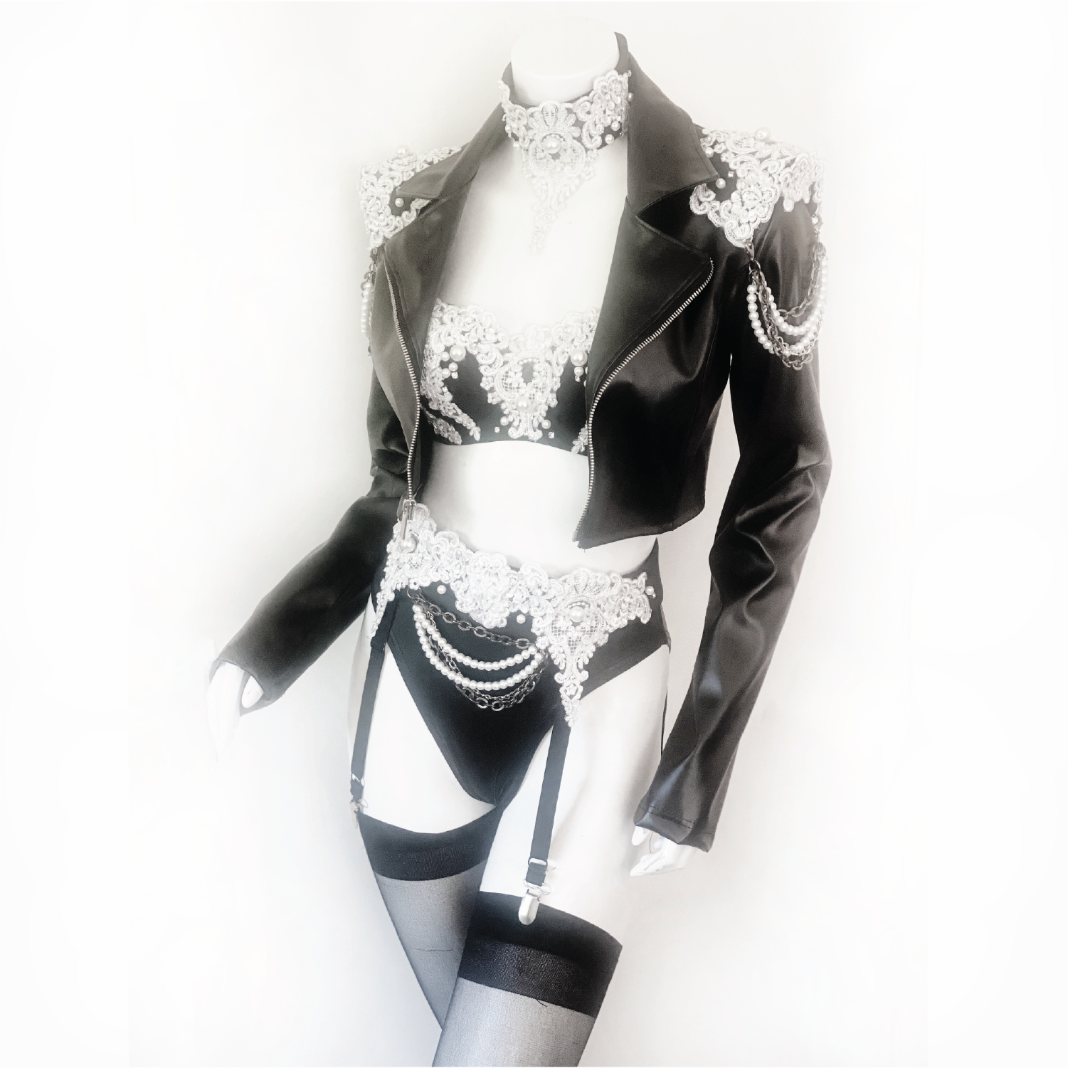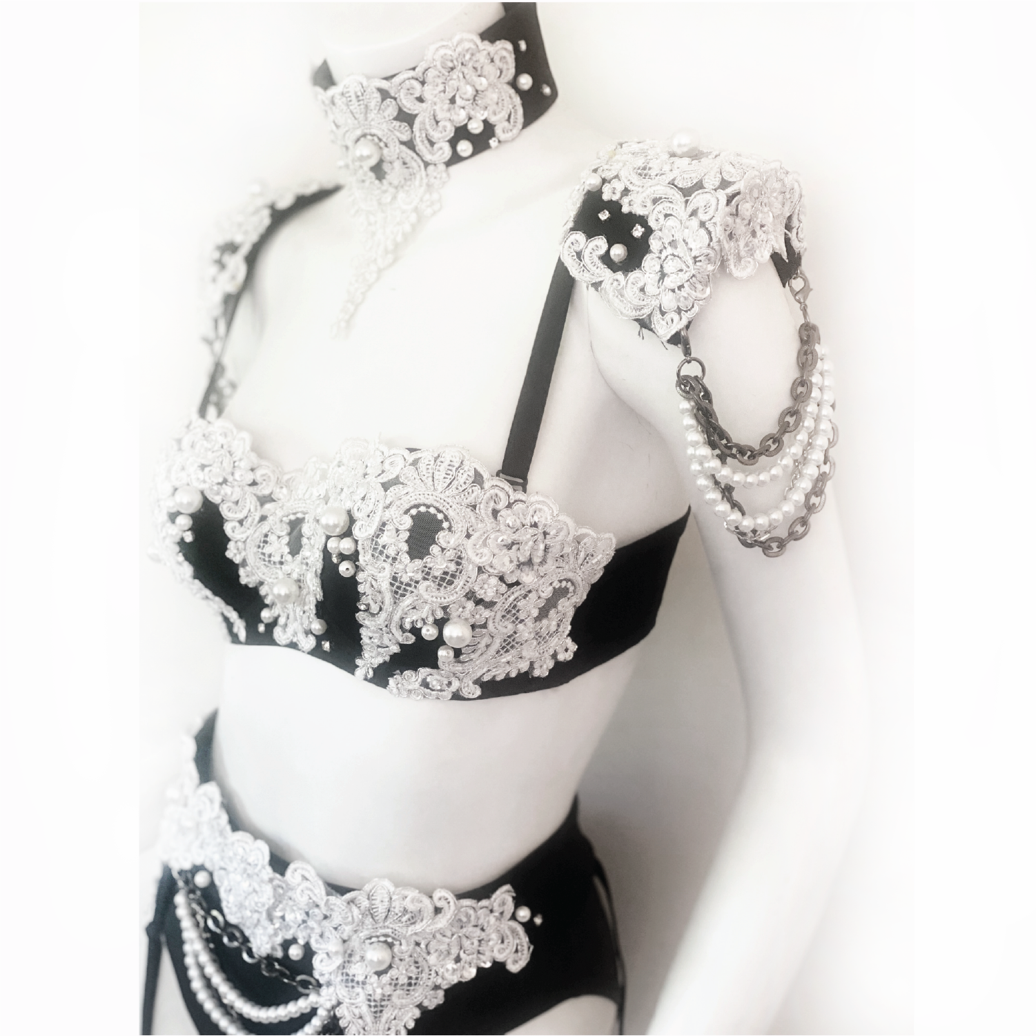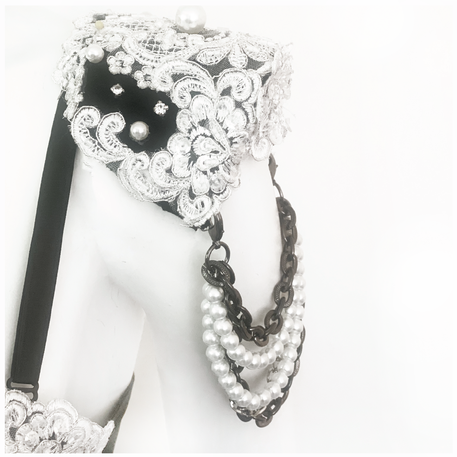 Top off the look with these elegant & edgy epaulettes that match any of our Vixen Noir separates. These one-of-a-kind shoulder stunners pin on to any bra or jacket! Pearl and chain drape can be removed to suit your mood 😀